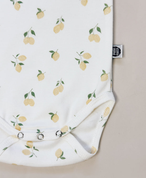 A estampa Limone é o ponto central deste body. Inspirada nas frutas frescas típicas da costa italiana, ela apresenta o limão siciliano em formato pequeno e delicado. Os desenhos surgem de maneira suave, sem excessos, criando um padrão leve que remete à estética das varandas mediterrâneas com limões colhidos ao sol. Para quem busca body de limão, body de limao, body limao siciliano, body de frutinhas ou roupa de bebê com frutas amarelas, essa estampa oferece um visual que se destaca de forma discreta e elegante.