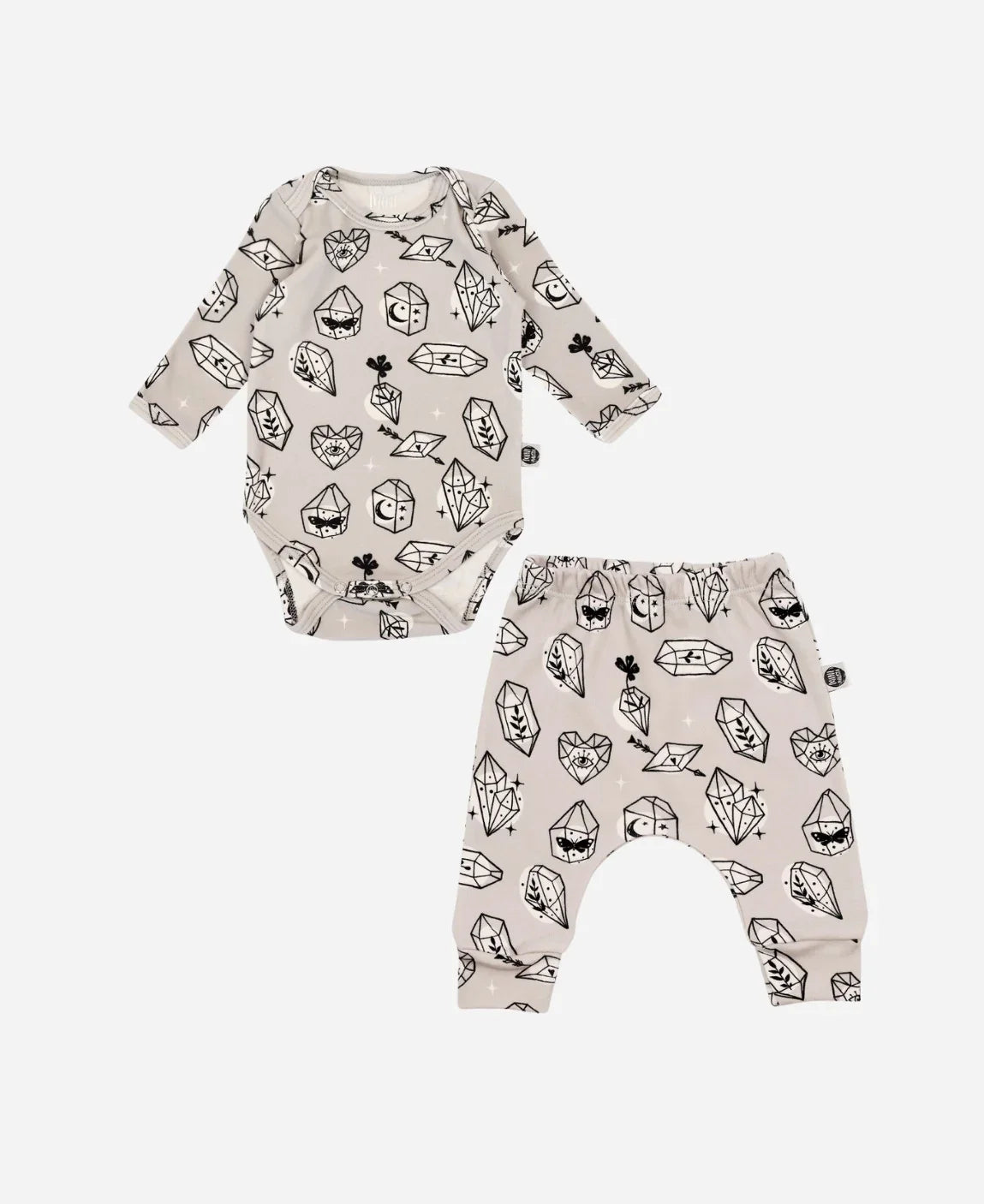 O Conjunto Body Manga Longa e Calça Bebê Crystal da MiniMalista Baby é a união perfeita entre delicadeza, conforto e design contemporâneo. Inspirado na pureza dos cristais, ele traz um toque mágico e elegante ao enxoval do bebê — com estampa exclusiva, traços minimalistas e tecido 100% algodão premium.
