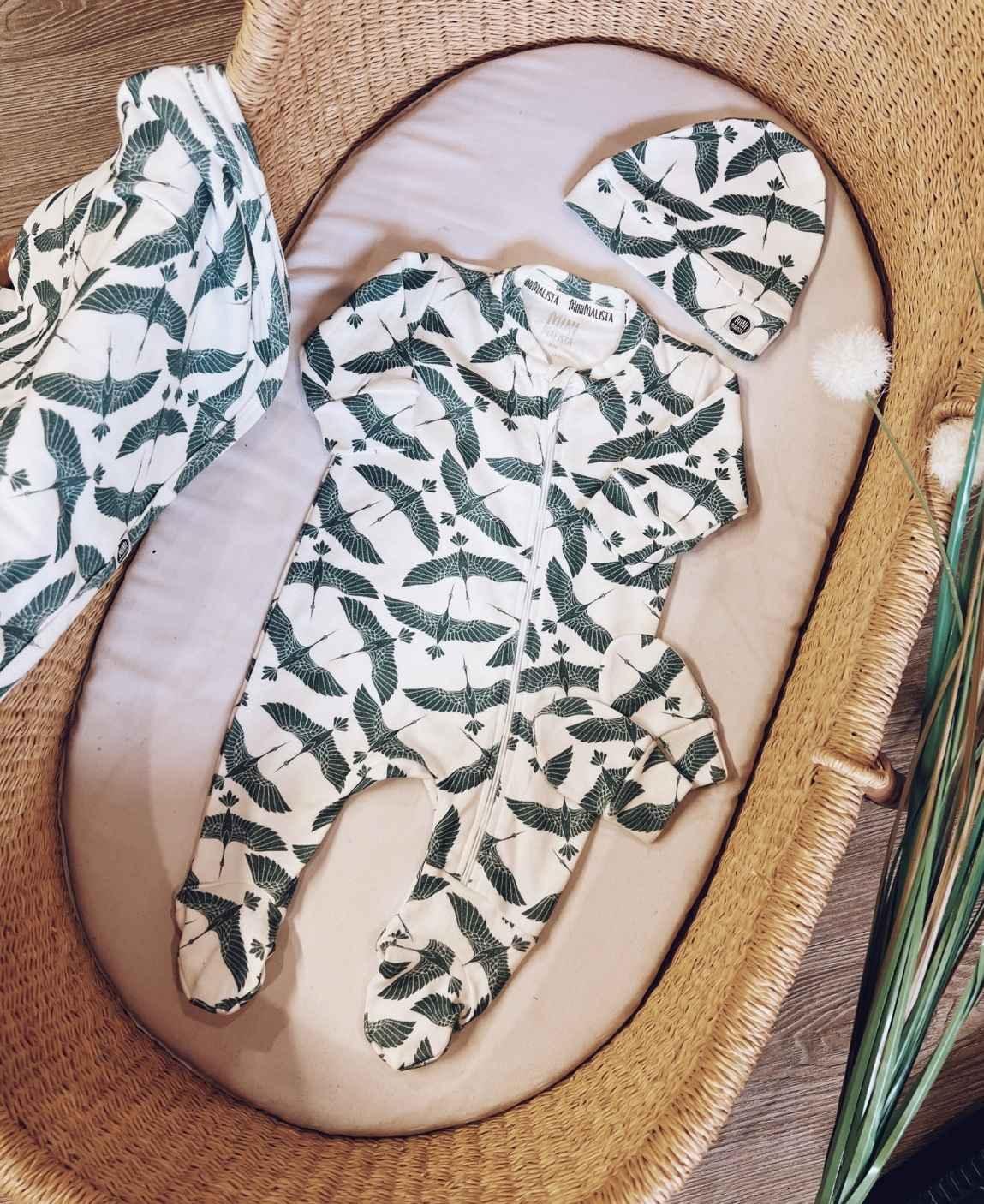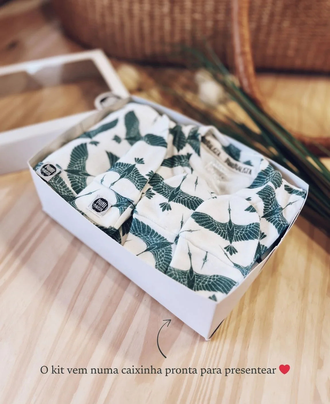 Composto por peças coordenadas na estampa exclusiva Blue Flock, o kit oferece praticidade, conforto e beleza desde os primeiros dias — uma escolha perfeita para saída de maternidade e para os primeiros registros do recém-nascido.