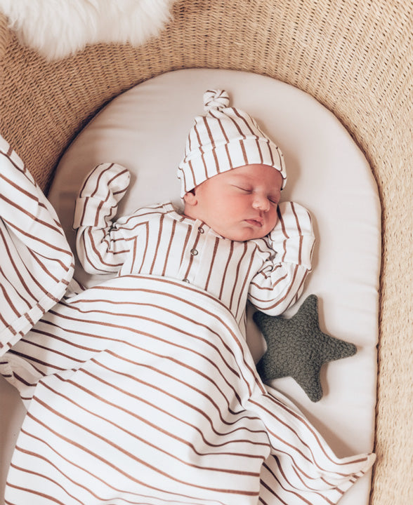 O contraste entre o fundo off-white e o tom quente das listras remete à natureza e combina com o estilo escandinavo que inspira a MiniMalista Baby.