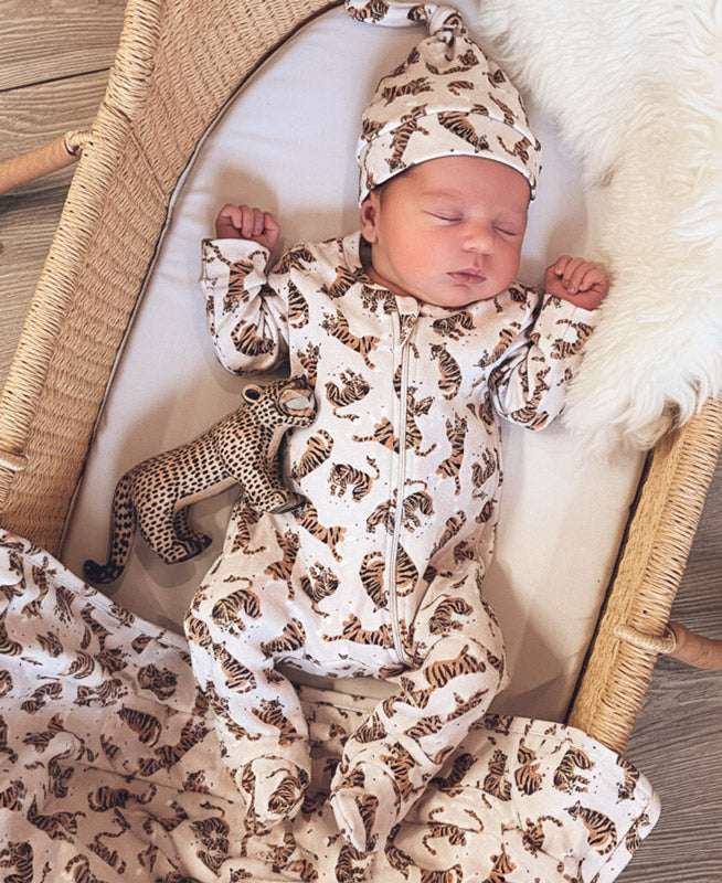 Com fundo bege claro e estampas de tigres em tons naturais, o kit é uma homenagem à beleza selvagem e à pureza do recém-nascido.
