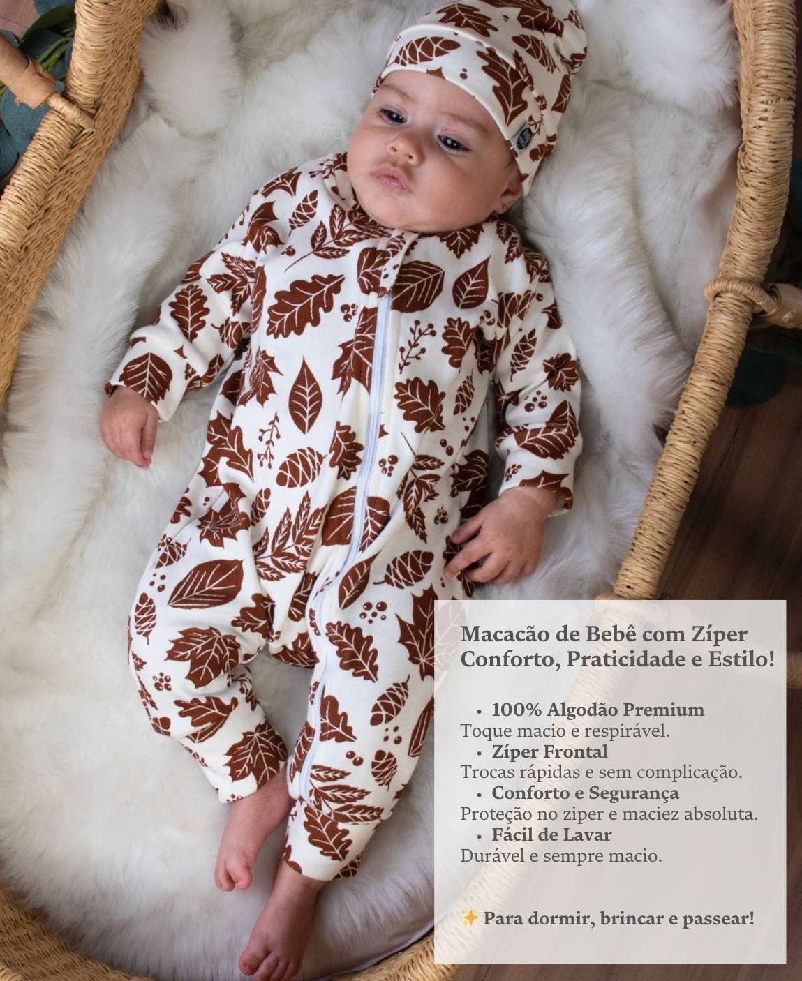 🍁 Macacão com zíper frontal e pezinho – facilita o momento da troca e evita desconforto, dispensando vestir pela cabeça. A modelagem é ampla, permitindo liberdade de movimento e aconchego.