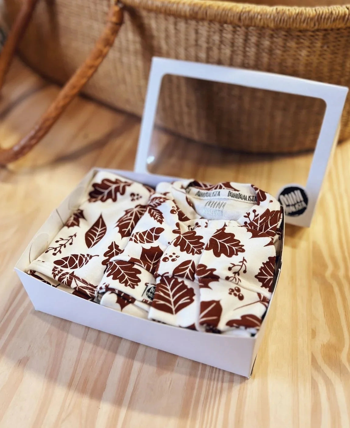 Como um abraço em tarde de outono, o Kit Presente Saída de Maternidade Bebê 4 Peças | Estampa Fall acolhe o bebê com a suavidade e o calor que só o amor de um começo de vida pode ter.
