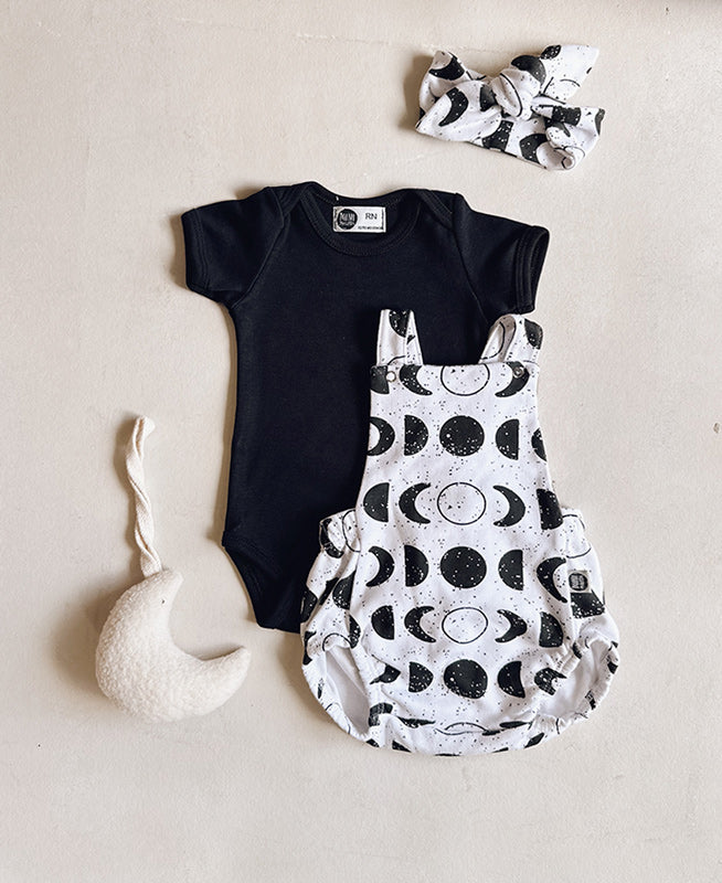 Conjunto Verão Bebê Menina Body + Jardineira + Faixinha | Preto e Lunar