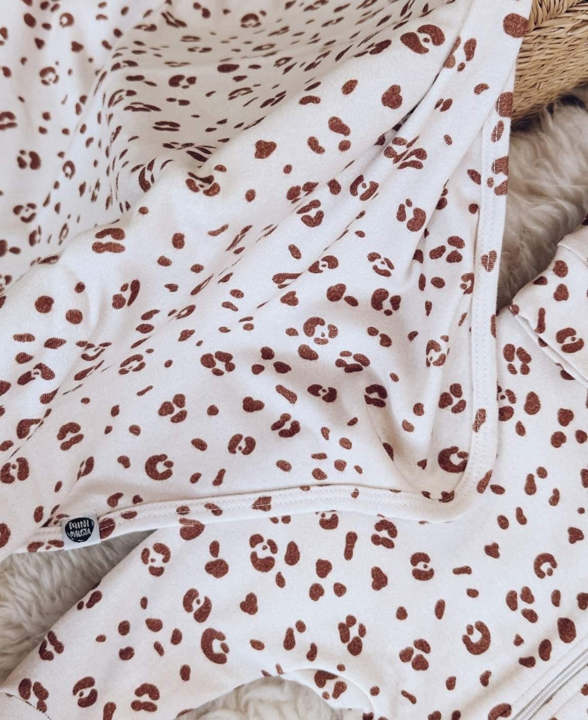 A estampa Jaguar, com fundo off-white e manchinhas em tom marrom-terroso, é um convite à suavidade e à elegância natural.