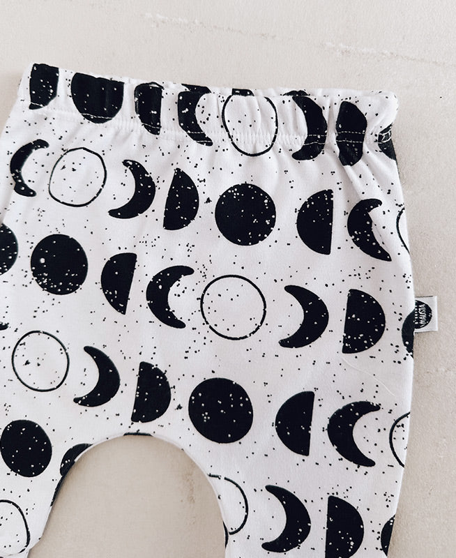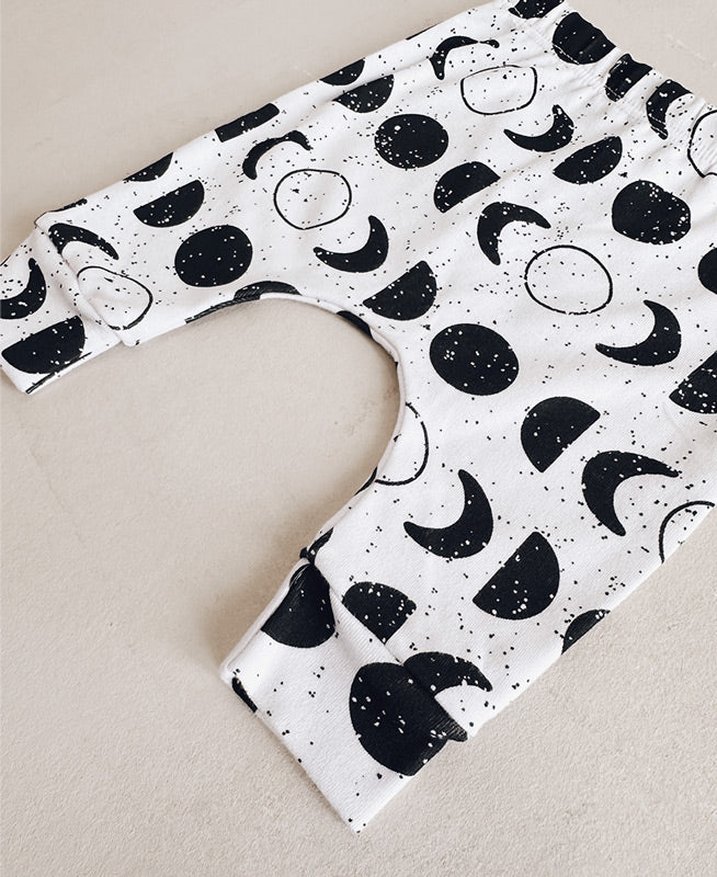 - Calça Harem Unissex Lunar — estampa exclusiva de fases da lua em preto e branco. Modelagem harem com cós elástico e punho dobrado, ideal para o movimento livre do bebê.