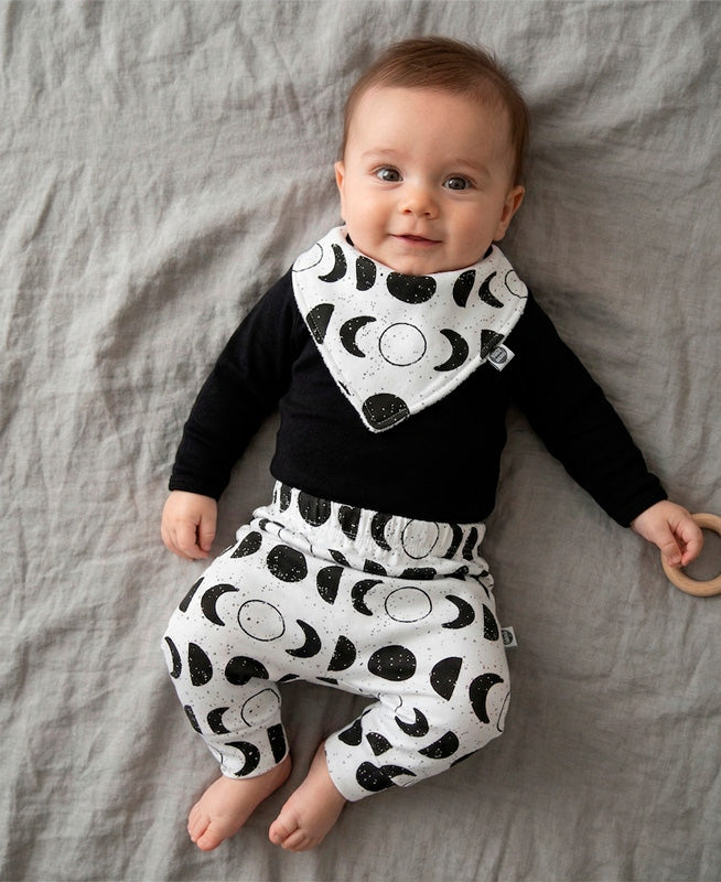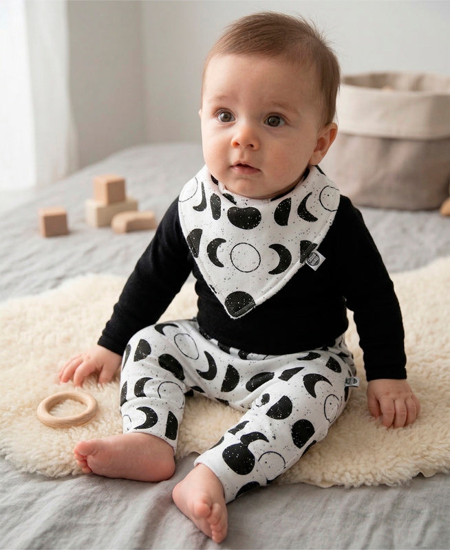 Kit Conjunto Bebê Unissex Lunar | Body Manga Longa Preto + Calça Harem + Babador Bandana