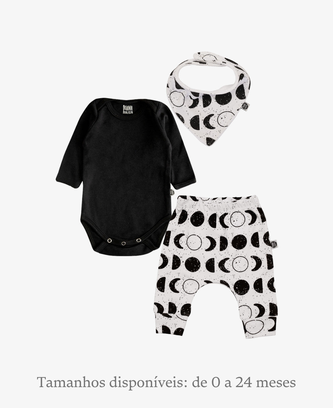 Um look completo para os pequenos que chegam ao mundo cheios de mistério e charme. O Kit Lunar reúne três peças combinadas em preto e branco, com estampa exclusiva de fases da lua — minimalista, atemporal e perfeito para qualquer bebê.
