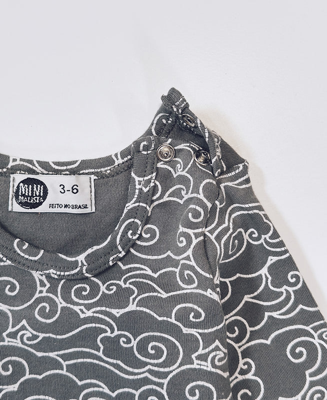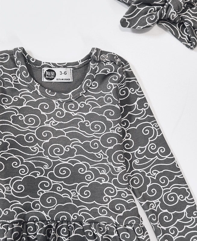 1 Body-Vestido Manga Longa na estampa Dreamy (contornos de nuvens brancas sobre um céu cinza profundo) e 1 Faixinha na mesma estampa.