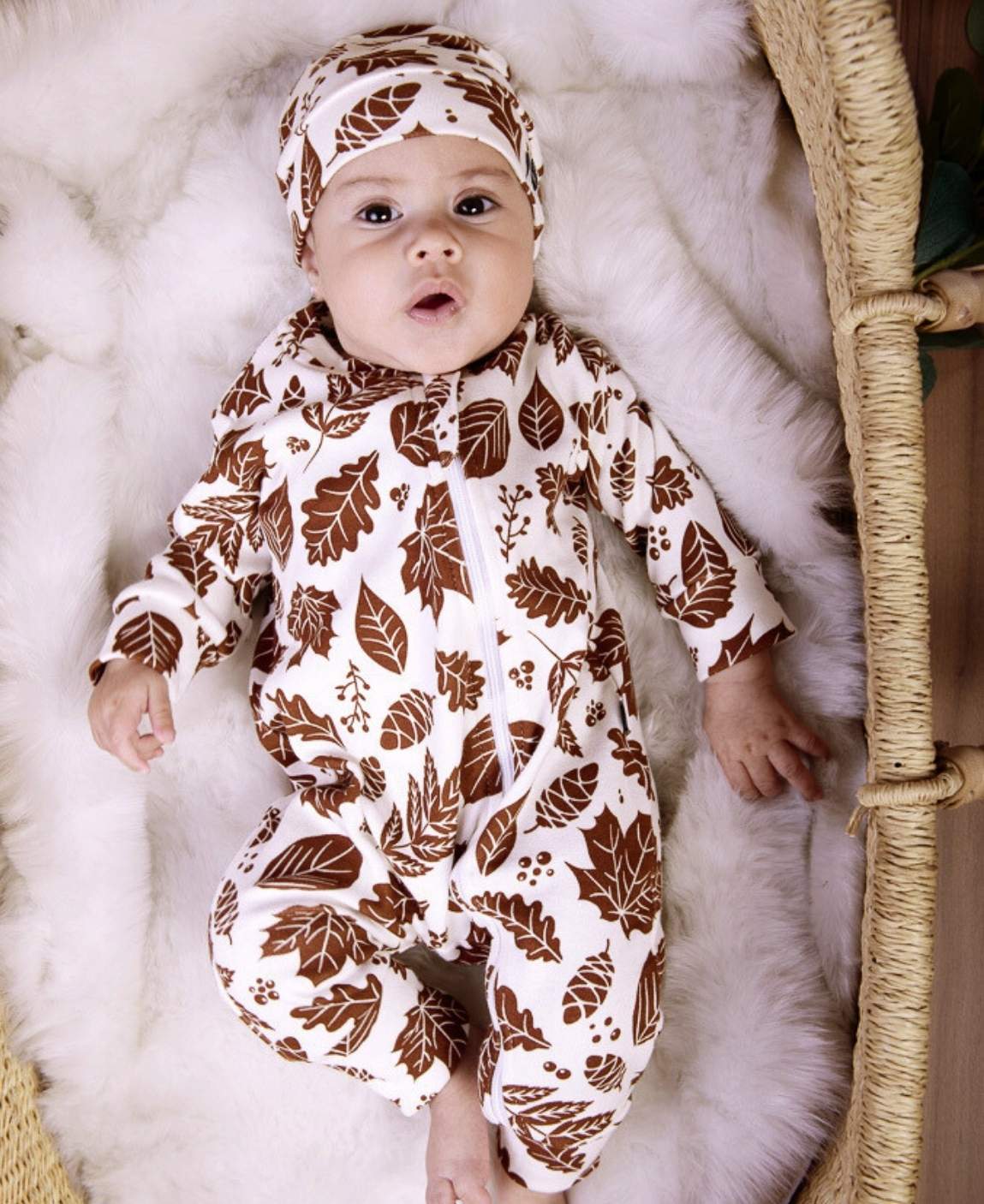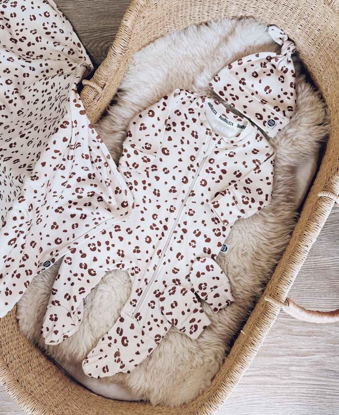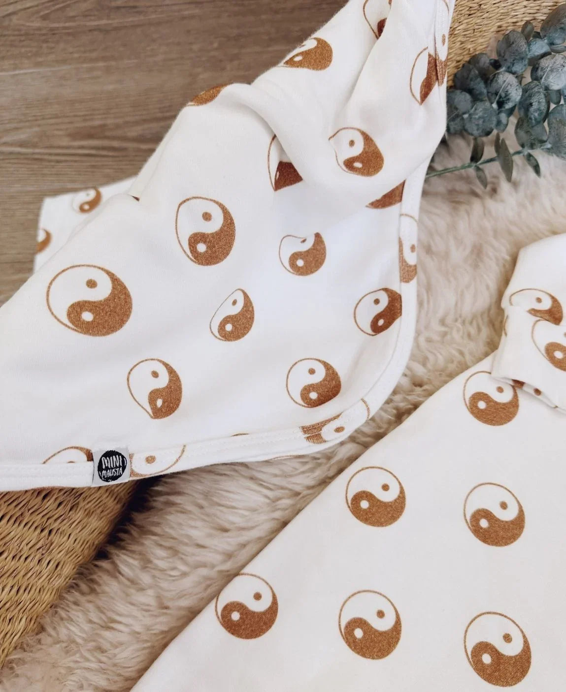A estampa Yin Yang, exclusiva da MiniMalista Baby, traz círculos em tom caramelo sobre fundo off-white, criando um visual moderno, equilibrado e cheio de personalidade.
