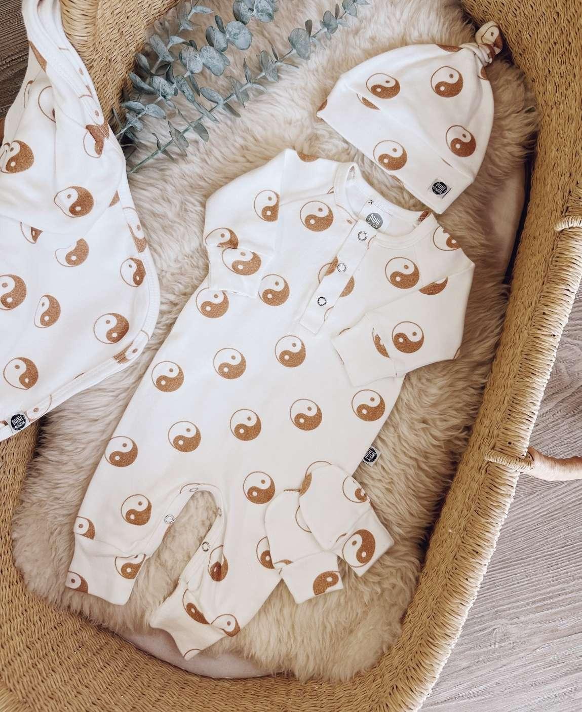 O Kit Presente Saída de Maternidade Bebê 4 Peças | Estampa Yin Yang foi criado para celebrar a chegada do bebê com leveza, conforto e harmonia.