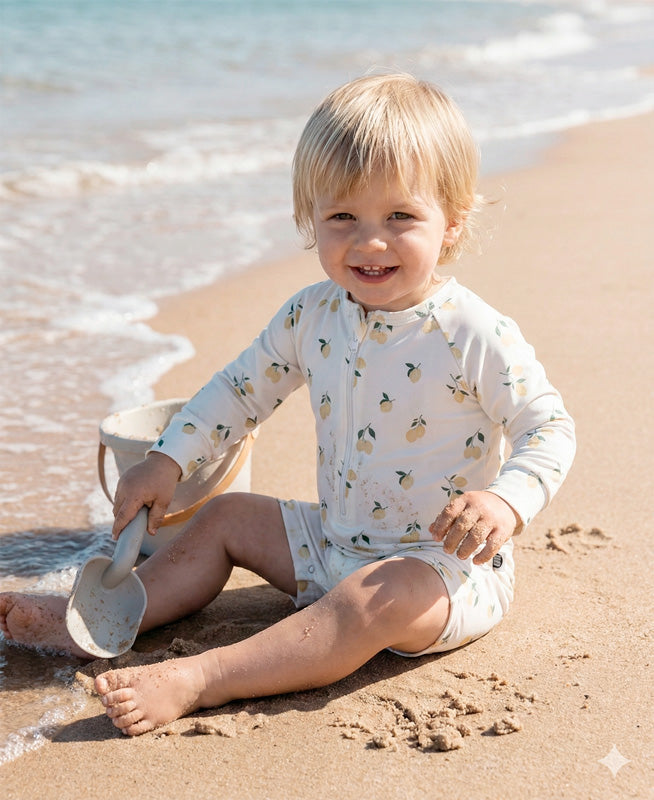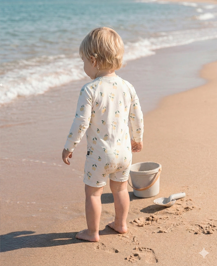 O Macaquinho de Praia Estampado UV50+ | Limone traduz o frescor do verão italiano em uma peça que une estética suave, segurança e funcionalidade. Com zíper frontal, botões entrepernas, estampa de limãozinho e proteção solar UV50+, ele é a escolha ideal para dias ensolarados repletos de brincadeira e alegria.